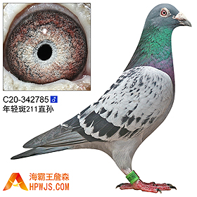 | 曾外祖父 B02-6478491 | 孙代 04年北京中鸽公棚赛629名 安徽天视公棚决赛72名 05年春北京京港公棚决赛 13名 06年秋季湖北三五公棚500公里决赛210名 06年杭州蓝天280公里预赛595名 06年杭州蓝天秋季500公里决赛29名 06年西安威奇公棚300公里预赛1423名 06年西安威奇公棚500公里决赛80名 06年辽宁千山秋季500公里决赛1名 06年山西红太阳秋季300公里预赛799名 06年山西红太阳秋季500公里决赛279名 06年山西红太阳秋季300公里预赛1207名 第一届海霸王专棚赛加战赛第2关7名 10年汕头友谊联合会春季莆田350公里登记赛 35名 10年汕头友谊联合会秋季莆田350公里登记赛 420羽 33名 10年广东省汕头龙湖赛鸽公棚500公里决赛 400名 11年汕头奋翔俱乐部冬季福安500公里指定赛 109羽 14名 第九届海霸王专棚赛300公里1名 17年秋湖北金楚信鸽交流中心502公里决赛 3945羽 267名