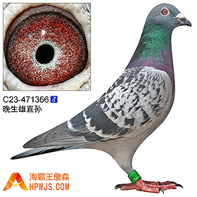 祖父 C05-101040 | 本身 05年广东江门康华公棚决赛冠军 05年广东省锦标赛冠军 孙代 第五届海霸王专棚赛第5关350公里5名 10年汕头友谊联合会元旦杯莆田350公里登记赛 32名 10年辽宁千山赛鸽俱乐部秋季决赛500公里616名 10年西安市威奇信鸽公棚秋季500公里决赛 195名 11年汕头金平鸽会秋季大奖赛莆田350公里A指定赛 168羽 10名 11年汕头金平鸽会秋季大奖赛莆田350公里登记赛 445羽 15名 11年汕头金平鸽会秋季大奖赛莆田350公里B指定赛 384羽 16名 14年秋广东省汕头市信源赛鸽公棚决赛 420名 15年秋汕头市会500公里福安常规赛 2500羽 12名 19年秋广州浩羽(黄埔)公棚550公里附加赛 1292羽 30名 20年秋广东潮州爱亚卡普公棚100公里资格站 B档200三羽组 冠军 20年秋广东潮州爱亚卡普公棚100公里资格站 E档单关100元 冠军 20年秋广东潮州爱亚卡普公棚100公里资格站 C档200元11取1 亚军 20年秋广东潮州爱亚卡普公棚100公里资格站 H档大家乐200 季军 20年秋广东潮州爱亚卡普公棚100公里资格站 4454羽 40名 21年秋广东汕头龙湖公棚165公里热身赛 4768羽 60名 22年秋广东尔翔公棚666公里加站赛 4739羽 78名 10年秋季陆丰市鸽会700公里幼鸽赛 冠军