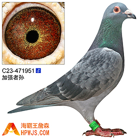 | 母亲 C14-249489 | 孙代 25年秋广东自信者公棚500公里决赛 6029羽 838名 平辈子代 04年广州浩羽公棚决赛 9名 05年辽宁捷威公棚预赛 66名 06年西安威奇公棚300公里预赛1391名 第一届海霸王专棚赛第9关6名 15年秋广东恒通公棚500公里决赛 273名 16年秋广东恒通公棚500公里决赛 58名 17年秋广东广州浩羽(黄埔)公棚第四关500公里决赛 2787羽 452名 18年春重庆新东方公棚第二关280公里 1948羽 25名 18年春重庆新东方公棚第一关200公里 3120羽 68名 18年春重庆新东方公棚第二关280公里 友谊赛300元 入赏 18年春重庆新东方公棚第二关280公里 十一取一300元 入赏 20年秋广东揭翔公棚500公里决赛 4101羽 40名 23年秋广东海翔公棚500公里决赛B2-600 入赏 23年秋广东海翔公棚500公里决赛 8822羽 808名 24年秋广东尔翔公棚160公里热身赛 9628羽 62名 24年秋广东揭翔公棚500公里决赛 2417羽 294名