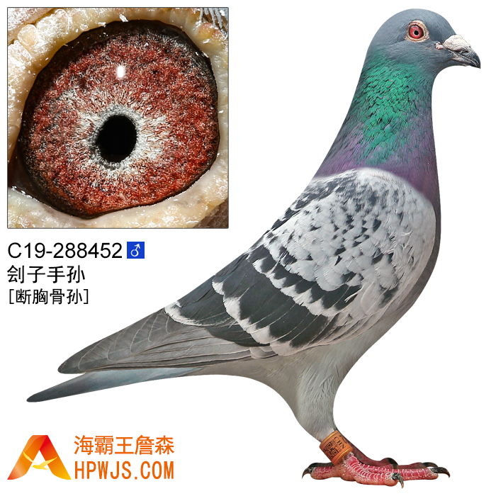 | 曾外祖父 B91-6227403 | 子代 詹森清舍拍卖种鸽 孙代 00年泰国国际公开赛580公里冠军 00年泰国国际赛580公里6名 詹森清舍拍卖种鸽 00年台北县新庄中港支会春季七关综合6位 01年台北县树林永安支会春季综合7位 02年台北县永和新和支会秋季五关综合2位 詹森清舍拍卖种鸽 1999年台北市内湖成功支会春季综合10位